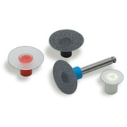Poli-Pro Discs are made of strong, thin polyester film coated with micro-grained abrasives. The disc is bonded to a rubber mount that slips easily onto a specially designed stainless steel shank. The rubber mount covers the shank to protect tooth structure and provide easy mounting and removal, yet holds firmly during use. Because Poli-Pro Discs have no metal centers or protruding shanks that can gouge or discolor composite, they provide fast, worry-free finishing and polishing of all composite restorations.
